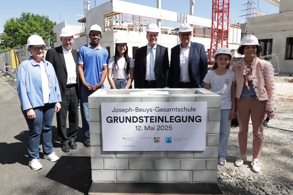 Am Geburtstag von Joseph Beuys: Oberbürgermeister Dr. Stephan Keller legte am Montag, 12. Mai 2025, den Grundstein für den neuen Erweiterungsbau an der nach dem Künstler benannten Joseph-Beuys-Gesamtschule. Im Zuge des Bauvorhabens wird der gesamte Schulstandort saniert und zukunftsfähig gestaltet.