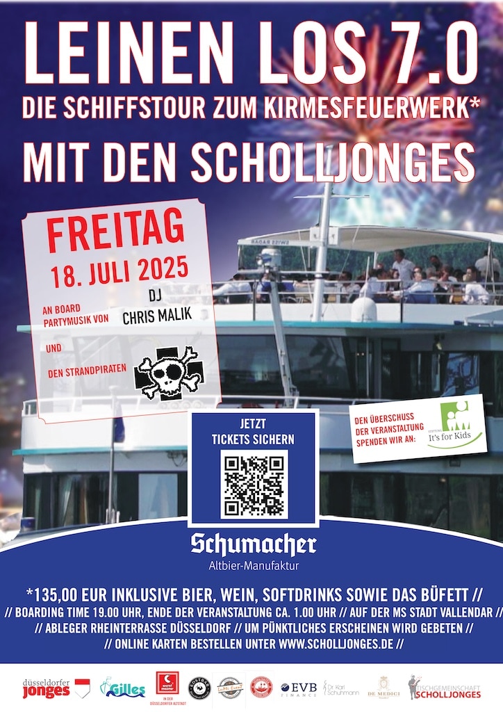 Am Freitag, den 18. Juli 2025, heißt es wieder „Leinen los“ bei der beliebten Schiffstour der Tischgemeinschaft Scholljonges der Düsseldorfer Jongs. Bereits zum siebten Mal laden die Scholljonges zur gemeinsamen Ausfahrt auf der MS Stadt Vallendar ein, um das spektakuläre Feuerwerk der Rheinkirmes vom Wasser aus zu erleben.