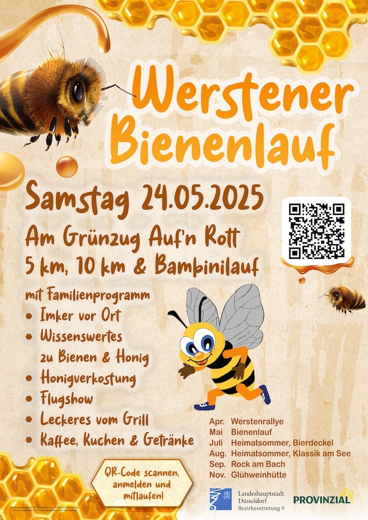 Bereits zum vier­ten Mal lädt die Wer­be­ge­mein­schaft Wir in Wers­ten e.V. zum belieb­ten Wers­te­ner Bie­nen­lauf ein. Am 24. Mai 2025 ver­wan­delt sich der Wers­te­ner Grün­zug erneut in eine leben­dige Lauf- und Erleb­nis­zone für Groß und Klein. Anlass ist der Welt­bi­e­nen­tag, der jähr­lich am 20. Mai auf die Bedeu­tung der Wild- und Honig­bie­nen auf­merk­sam macht.