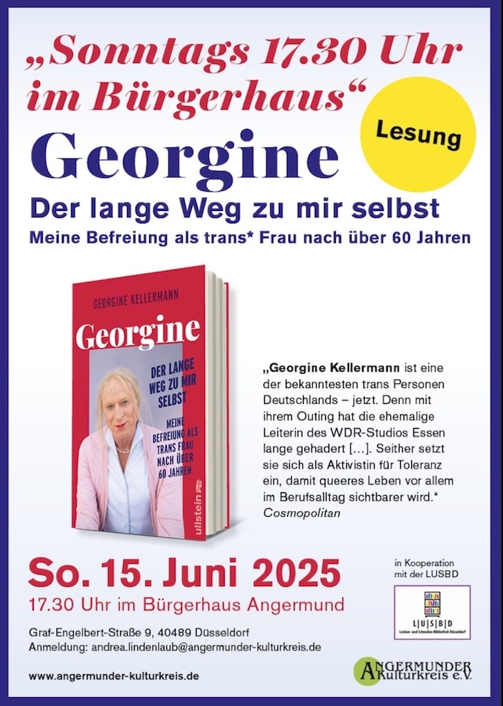 Den langen Weg zu sich selbst beschreibt Georgine Kellermann in ihrem Buch, aus dem sie am 15. Juni im pittoresken Bürgerhaus in Angermund lesen wird. Denn aus dem Mann wurde eine Frau.
