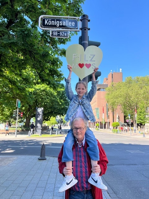 Das Ergebnis kann sich sehen lassen: Das Foto zeigt das Düsseldorfer Straßenschild der berühmten Königsallee als Erkennungsmerkmal des Wohnorts. Elisa und ihr Opa sind gemeinsam zu sehen – jung und alt vereint. Und das Urlaubsziel Filzmoos ist liebevoll in Herzform dargestellt, wobei zwei rote Herzen symbolisch die „00“ ersetzen.