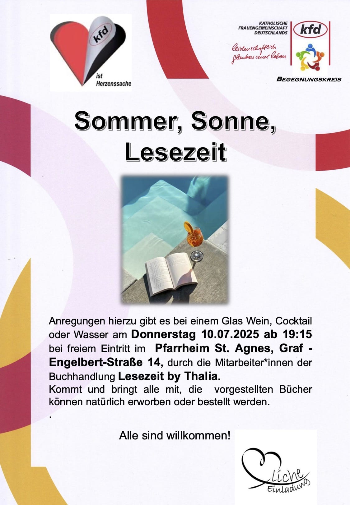 Die kfd Angermund lädt am Donnerstag, dem 10. Juli, ab 19:15 Uhr zu einem besonderen Abend ein: Die Mitarbeiter*innen der „Lesezeit by Thalia Kaiserswerth“ bringen Bücher mit und stellen sie vor.