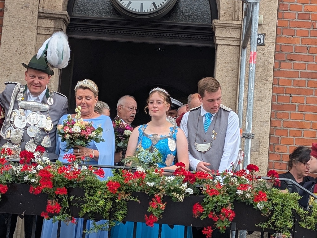 Pünkt­lich zur Parade um 16 Uhr ver­sam­mel­ten sich die Grup­pen der Kai­sers­wert­her St. Sebas­tia­nus-Bru­der­schaft 1285 e.V. vor dem Rat­haus. Und auch auf dem Bal­kon tum­mel­ten sich die Majes­tä­ten, die die letz­ten Stun­den ihrer Regent­schaft sicht­lich genie­ßen konnten.