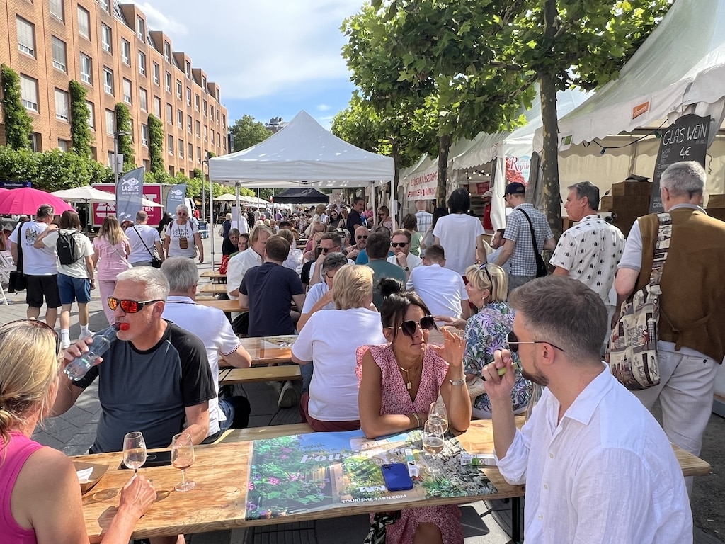 Ein weiterer Publikumsmagnet war der französische Wochenmarkt „Les Saveurs de France“ am Rheinufer. Dort präsentierten Aussteller aus verschiedenen französischen Regionen eine große Auswahl an regionalen Spezialitäten – von Käse über Wein bis zu süßen Leckereien. Trotz vereinzelter Regenschauer füllten sich die Gassen schnell wieder mit gut gelaunten Besucherinnen und Besuchern.