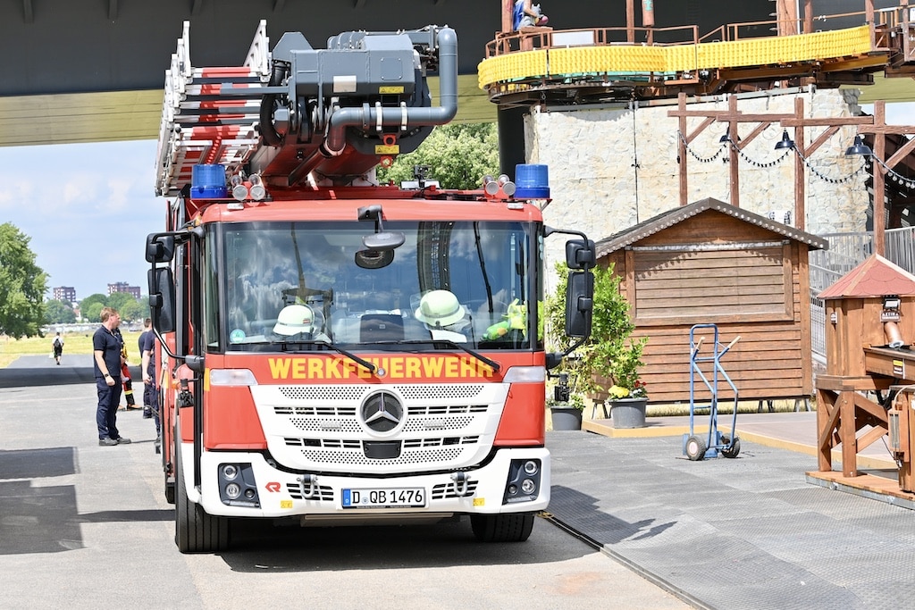 Gerade an beson­ders besu­cher­star­ken Tagen, etwa bei den Droh­nen­shows oder dem Abschluss­feu­er­werk, wird zusätz­li­ches Per­so­nal und Gerät auf der links­rhei­ni­schen Seite sta­tio­niert. Um mög­li­che Ver­zö­ge­run­gen bei der Anfahrt über die Rhein­brü­cken zu ver­mei­den, steht eine mobile Feu­er­wa­che mit Not­arzt und Lösch­fahr­zeug in unmit­tel­ba­rer Nähe bereit. Damit ist gewähr­leis­tet, dass Hilfe im Not­fall in kür­zes­ter Zeit geleis­tet wer­den kann.