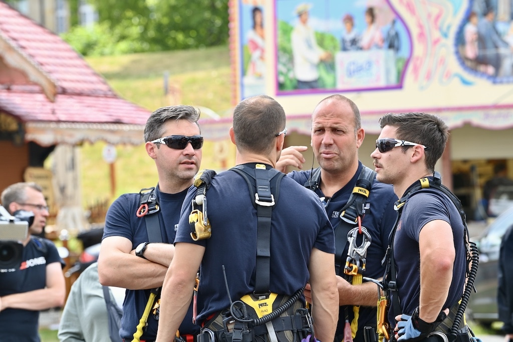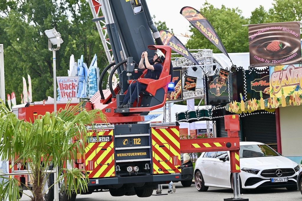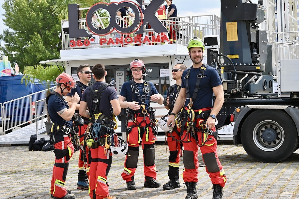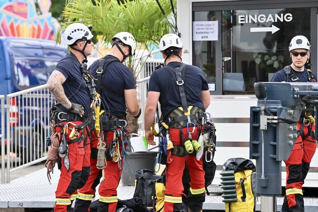 Schon Tage vor der offi­zi­el­len Eröff­nung trai­nie­ren die Höhen­ret­ter der Feu­er­wehr den Ernst­fall. Wenn sich Gon­deln in schwin­del­erre­gen­der Höhe fest­set­zen oder eine tech­ni­sche Stö­rung ein­tritt, zählt jede Sekunde. Weil her­kömm­li­che Ret­tungs­fahr­zeuge wie die Dreh­lei­ter nur begrenzt ein­setz­bar sind, über­neh­men spe­zi­ell geschulte Ein­satz­kräfte die Auf­gabe, Per­so­nen aus bis zu 80 Meter Höhe sicher zu Boden zu brin­gen. Die­ses Trai­ning hat Tra­di­tion und fin­det jähr­lich direkt an den auf­ge­bau­ten Fahr­ge­schäf­ten statt – eine Maß­nahme, die Sicher­heit schafft und im Ernst­fall wert­volle Zeit spart.