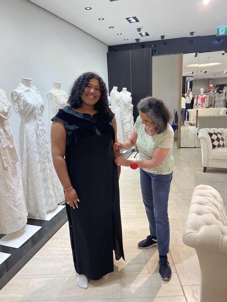 Die aufwändig gearbeitete Robe aus edler schwarz-blauer Seide und Samt wurde gestern im renommierten KÖ-Center in Düsseldorf final angepasst. Das Kleid soll nicht nur ein modisches Statement setzen, sondern auch ein Zeichen der Unterstützung für Kinder in Not sein.