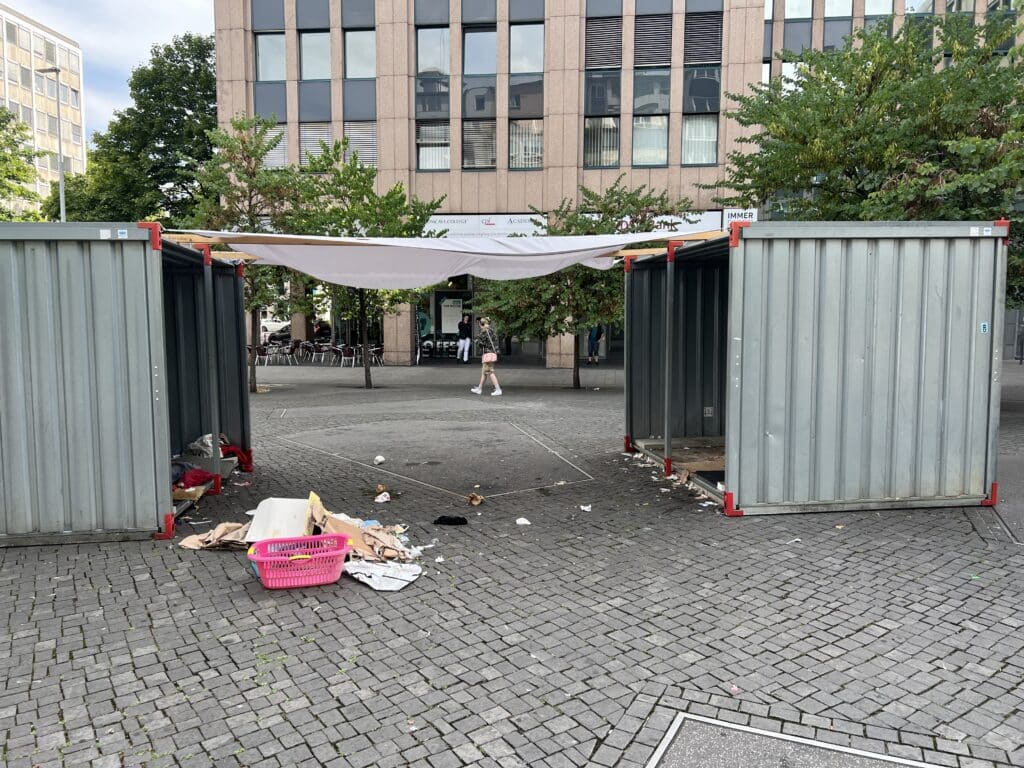 Als Krönung wurden noch sechs Dixi-Klos auf dem Platz verteilt. Wer vom Hauptbahnhof kommend dort vorbeigeht, reibt sich ungläubig die Augen oder schüttelt einfach nur den Kopf. Es wirkt, als würde man live in ein schlecht inszeniertes Reality-TV-Format geraten – „Big Brother“ lässt grüßen.