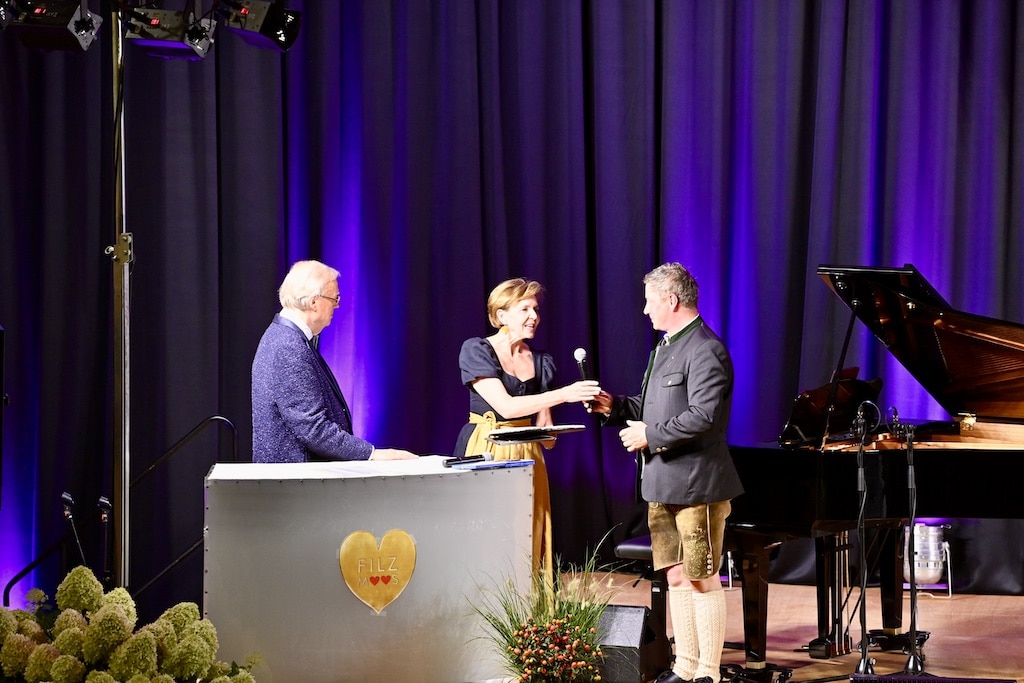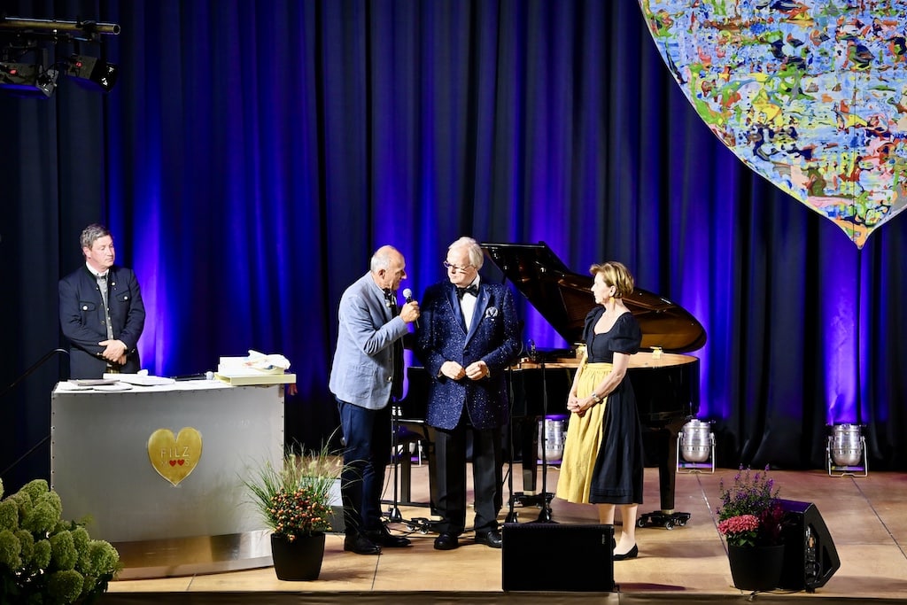 Eröffnet wurde der Gala-Abend von Bürgermeister Josef Hofer und Landtagspräsidentin Dr. Brigitta Pallauf, die in ihren Grußworten die jahrzehntelange Arbeit von Heribert Klein würdigten. Seit über drei Jahrzehnten gelingt es ihm, Künstlerinnen und Künstler aus aller Welt nach Filzmoos zu bringen, um sich in den Dienst der UNICEF-Hilfe zu stellen. Als Dank überreichte Leo Bauernberger, Geschäftsführer von SalzburgerLand Tourismus, dem begeisterten Fortuna-Düsseldorf-Fan Klein ein Sondertrikot von Red Bull Salzburg mit der Rückennummer „35“. Verbunden war die Übergabe mit einer Einladung zur „Sound of Music Gala“ im Oktober im Großen Festspielhaus Salzburg.
