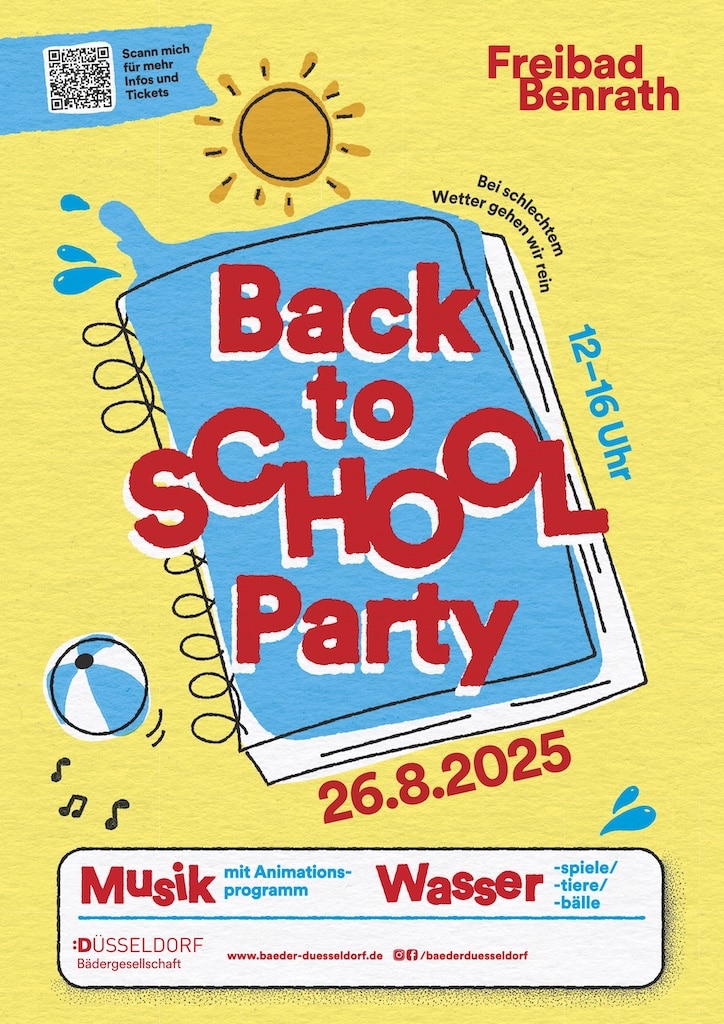 Mit einer bun­ten Back-to-School-Party ver­ab­schie­det die Bäder­ge­sell­schaft Düs­sel­dorf am Diens­tag, 26. August 2025, die Som­mer­fe­rien im Frei­bad Ben­rath. Von 12 bis 16 Uhr sind Kin­der, Jugend­li­che und Fami­lien ein­ge­la­den, den letz­ten Feri­en­tag mit Spiel, Spaß und Musik zu verbringen.