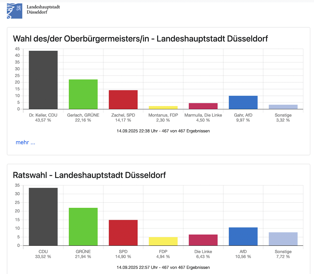 Im Lam­ber­tus­saal neben der gleich­na­mi­gen Kir­che fand der Jubel der Christ­de­mo­kra­ten Düs­sel­dorfs kaum ein Ende. In acht von zehn Bezirks­ver­tre­tun­gen erhiel­ten sie die Mehr­heit der abge­ge­be­nen Stim­men. Die rest­li­chen zwei gin­gen an die Grü­nen. Zudem zieht ihr Top­kan­di­dat Kel­ler ein­sam an der Spitze seine Kreise. 20 Pro­zent Vor­sprung vor sei­ner Kon­kur­ren­tin sind eine ziem­li­che Haus­num­mer. Ja, er habe schon mit einem deut­li­chen Ergeb­nis gerech­net, „aber so klar, das ist schon ein schö­nes Ergeb­nis. Da freue ich mich wirk­lich sehr drü­ber.“ Er glaube, dass seine Par­tei und er ein gutes Pro­gramm vor­ge­legt haben. Kel­ler: „Wir haben klar­ge­macht, dass es darum geht, die Wirt­schaft zu stär­ken, die Infra­struk­tur in Schuss zu hal­ten und für bezahl­ba­res Woh­nen zu sor­gen.“ Zudem habe er die Wäh­le­rin­nen und Wäh­ler davon über­zeu­gen kön­nen, die rich­tige Per­son für das Amt des Ober­bür­ger­meis­ters zu sein. „Ich habe viel Erfah­rung in die­sem Geschäft. Ich habe die Kom­pe­tenz. In Düs­sel­dorf muss man als Ober­bür­ger­meis­ter 13.000 Men­schen füh­ren. Da scha­det es nicht, beruf­li­che Erfah­run­gen mit­zu­brin­gen.“ Nun geht’s in den Wett­streit mit sei­ner Her­aus­for­de­rin Clara Ger­lach. Kel­ler: „Es wird einen enga­gier­ten Stra­ßen­wahl­kampf geben. Die Par­tei ist nach wie vor moti­viert, jetzt auch die OB-Wahl end­gül­tig zu gewin­nen. Des­halb wer­den wir sehr prä­sent auf der Straße sein. Wir wer­den wei­ter unse­ren Social-Media-Wahl­kampf füh­ren. Und von daher wird man uns auf allen Kanä­len begeg­nen. Wir wer­den in den nächs­ten zwei Wochen von uns hören lassen.“