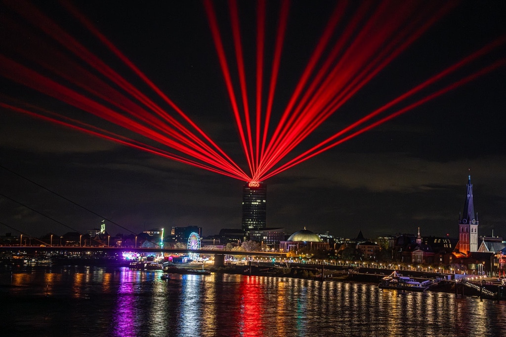 Sobald die Dunkelheit hereinbricht, verwandelt sich der Turm in eine leuchtende Bühne. Bis kurz nach Mitternacht tanzen farbige Laserstrahlen über den Rhein und zeichnen ein faszinierendes Panorama über die Stadt. Das Ganze wird von einer eigens komponierten Musik begleitet, die direkt vom Dach des ERGO-Towers erklingt.