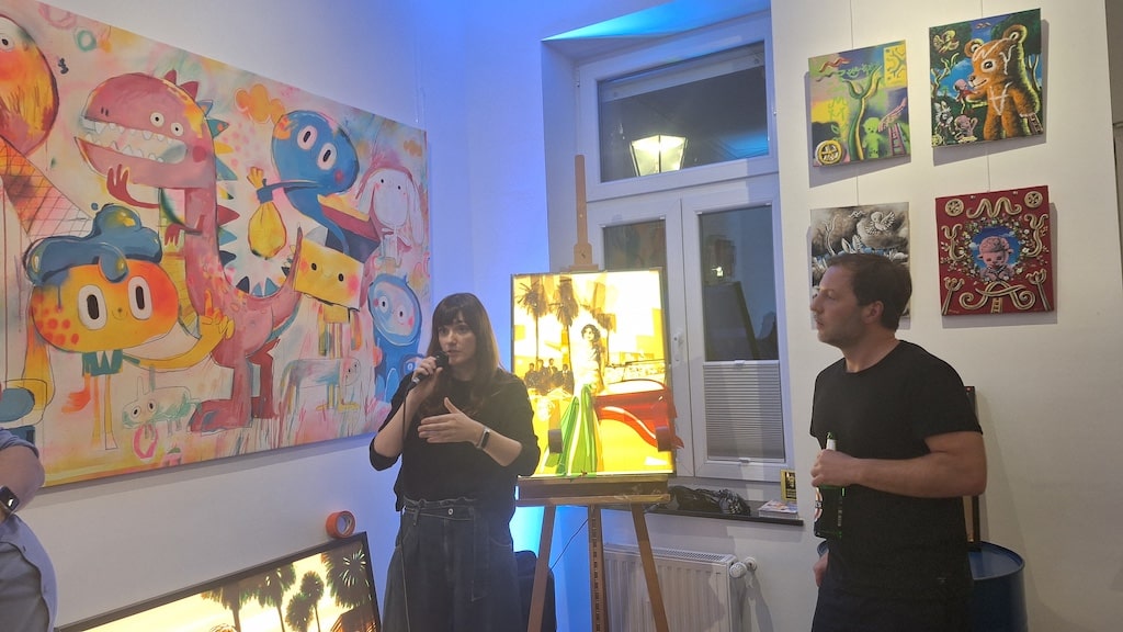 Die besondere Atmosphäre des Abends wurde durch die Anwesenheit der beiden Künstler Max Zorn aus Amsterdam und Lucia Astuy aus Madrid geprägt. Beide nahmen sich viel Zeit für Gespräche, Selfies und Fragen des Publikums. In einem englischsprachigen Künstlergespräch gaben sie spannende Einblicke in ihre kreative Arbeit. Zorn berichtete, wie er begann, mit Klebeband auf Plexiglas zu arbeiten, seine ersten Werke an Straßenlaternen anbrachte und schließlich durch ein virales Video internationale Aufmerksamkeit erlangte – bis hin zu einem Beitrag im US-Fernsehen bei CBS Sunday Morning.