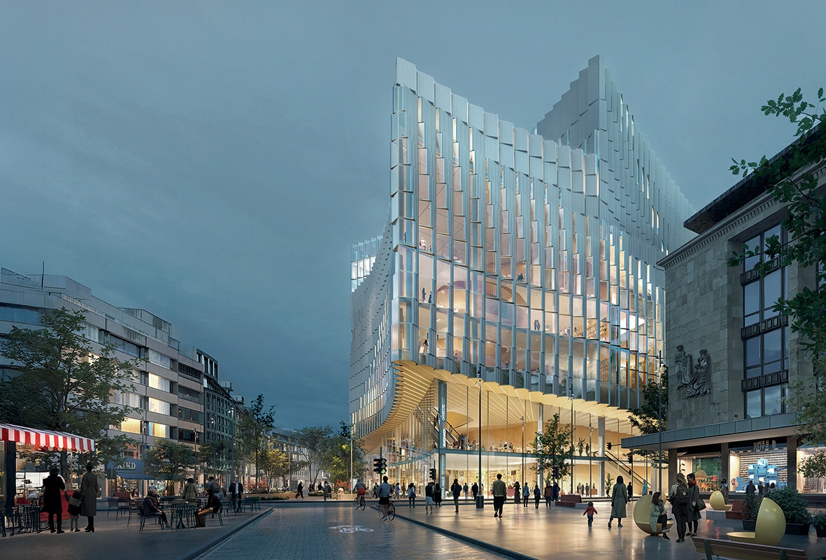 Es soll ein heller Stein (Sandstein) benutzt werden, und die Fassade ist durch zahlreiche Fenster durchbrochen – ein sehr großes übrigens als Panoramaausblick Richtung Karstadt. Dort, wo der Haupteingang zum Kaufhof lag, soll wohl auch die Oper betreten werden.