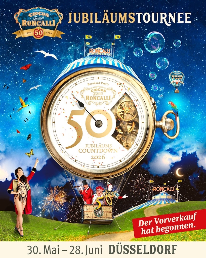 In Düs­sel­dorf kehrt das Cir­cus-Thea­ter Ron­calli anläss­lich sei­nes 50. Jubi­lä­ums zurück: Vom 30. Mai bis 28. Juni 2026 wird das Ron­calli-Zelt am Robert-Lehr-Ufer ste­hen und das neue Tour­nee-Pro­gramm „50 Jahre Ron­calli“ prä­sen­tie­ren. Der Zir­kus, unter der Lei­tung von Grün­der Bern­hard Paul, will nicht auf alte Erfolge zurück­bli­cken, son­dern „eine Tür in die Zukunft öff­nen“ – mit dem bekann­ten Ron­calli-Charme und fri­schen, inno­va­ti­ven Elementen.