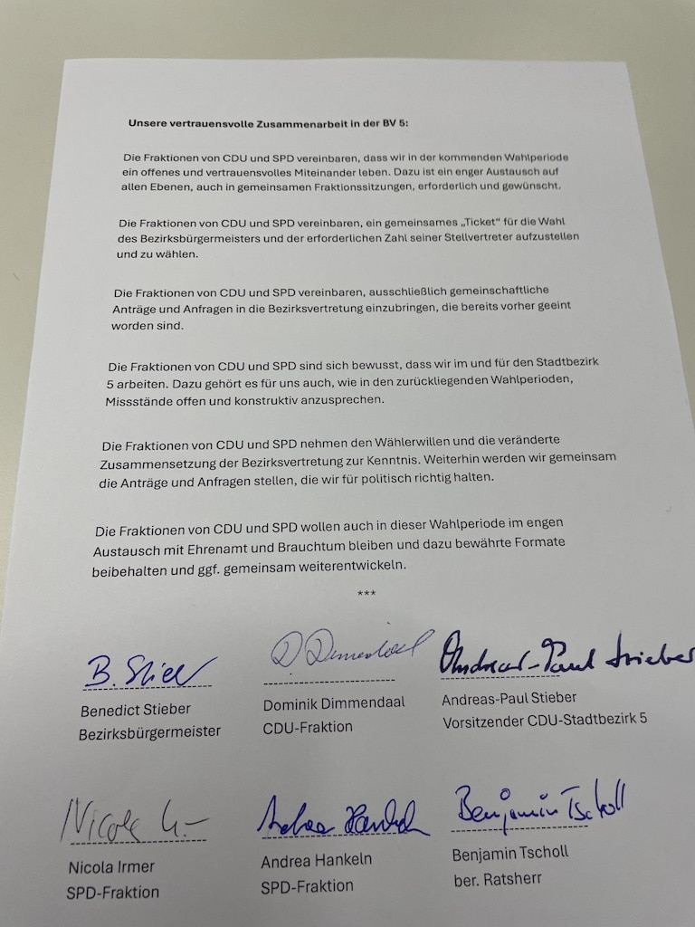 CDU und SPD wollen die kommenden fünf Jahre im Düsseldorfer Norden gemeinsam gestalten. Die Fraktionen beider Parteien in der Bezirksvertretung 5 (BV5) unterzeichneten zu Wochenbeginn einen Koalitionsvertrag, in dem sie „eine vertrauensvolle und verlässliche Zusammenarbeit zum Wohle der Menschen im Düsseldorfer Norden“ vereinbaren.