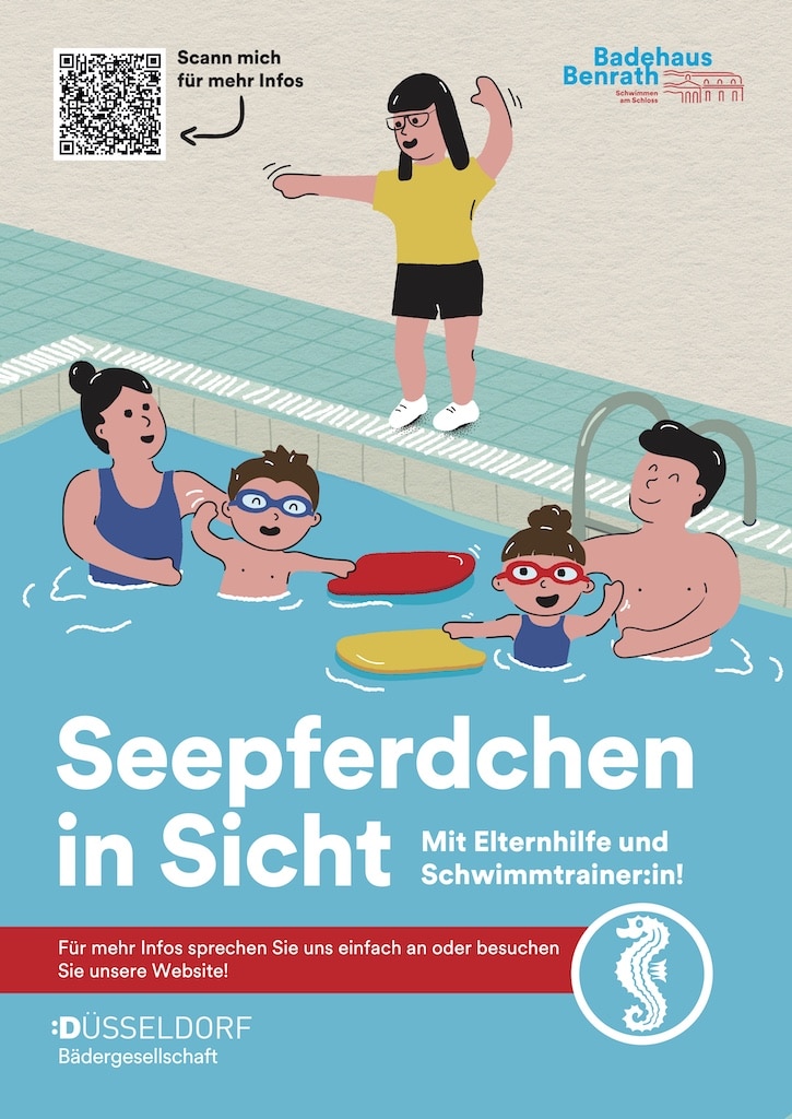 Das Format richtet sich an Kinder ab fünf Jahren, die kurz vor dem Erwerb ihres ersten Schwimmabzeichens stehen – dem beliebten Seepferdchen. Gemeinsam mit ihren Eltern üben die Nachwuchsschwimmer im Badehaus Benrath grundlegende Techniken des Brustschwimmens. Unterstützt werden sie dabei von erfahrenen Schwimmtrainer:innen, die vom Beckenrand aus individuell auf jedes der maximal sechs Eltern-Kind-Teams eingehen.