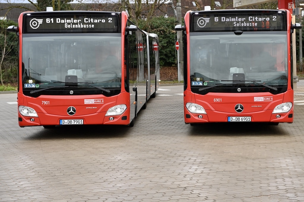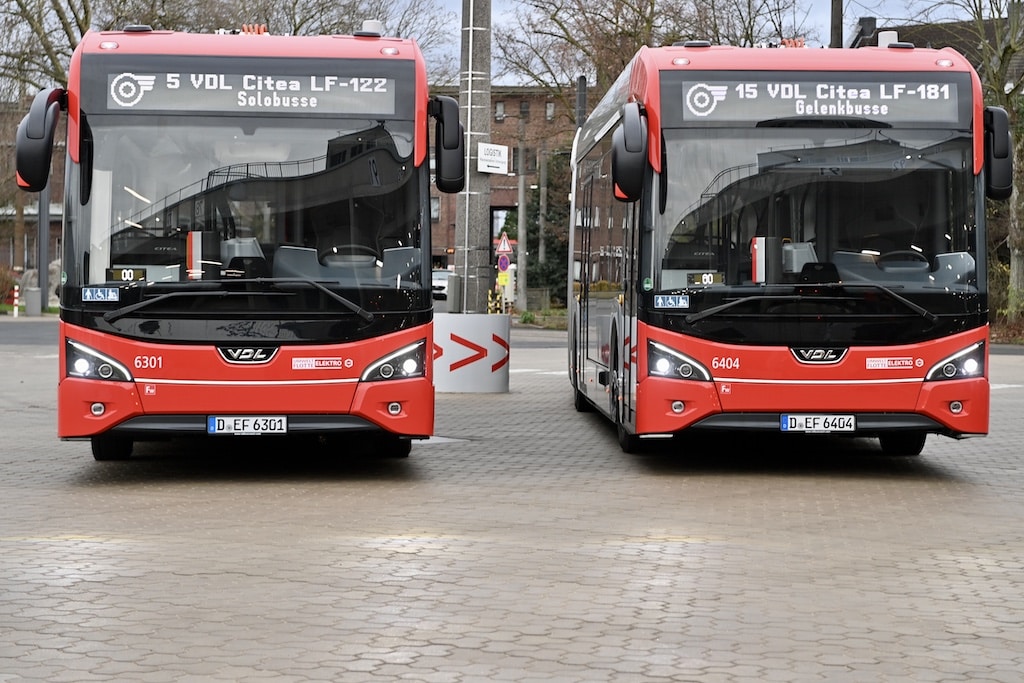 Die VDL‑Batteriebusse sol­len künf­tig auf Linien in Meer­busch, Neuss und dem links­rhei­ni­schen Düs­sel­dorf fah­ren. Die neuen Daimler‑Busse ver­stär­ken die Linien im Düs­sel­dor­fer Stadt­ge­biet sowie im Kreis Mett­mann.