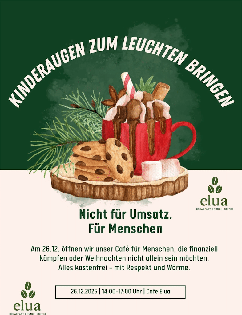 Während in vielen Wohnzimmern der zweite Weihnachtstag bei Kaffee und Kuchen ausklingt, bleibt für manche Menschen ein Cafébesuch ein seltener Luxus. Genau hier setzt eine besondere Aktion in Derendorf an: Am 26. Dezember öffnet das Café Elua am Hilde-und-Joseph-Neyses-Platz seine Türen – nicht als Geschäftsmodell, sondern als Einladung.