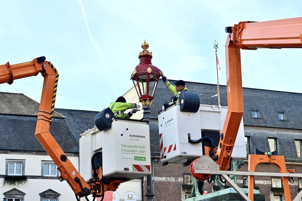 Aus­lö­ser für die Arbei­ten war zunächst ein Scha­den: Bei einem Ran­gier­un­fall wurde eine der his­to­ri­schen Leuch­ten stark beschä­digt. Schnell zeigte sich jedoch, dass eine bloße Repa­ra­tur dem Ensem­ble nicht gerecht gewor­den wäre. Die Stadt ent­schied sich gemein­sam mit der Netz­ge­sell­schaft Düs­sel­dorf, alle vier Leuch­ten grund­le­gend zu über­ar­bei­ten – mit hohem hand­werk­li­chem Auf­wand und viel Liebe zum Detail.