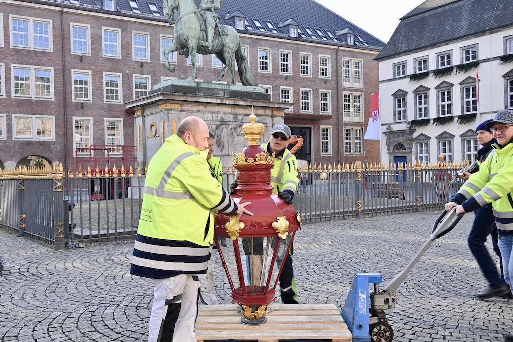 Der Markt­platz vor dem Rat­haus hat sein his­to­ri­sches Erschei­nungs­bild zurück – und ist zugleich ein Stück moder­ner gewor­den. Rund 100 Jahre nach ihrer Auf­stel­lung sind die vier mar­kan­ten Later­nen rund um das Jan-Wel­lem-Rei­ter­denk­mal umfas­send restau­riert und tech­nisch erneu­ert wor­den. Seit Don­ners­tag ste­hen die gene­ral­über­hol­ten Leuch­ten wie­der an ihrem Platz und tau­chen Denk­mal und Platz in warm­wei­ßes Licht.