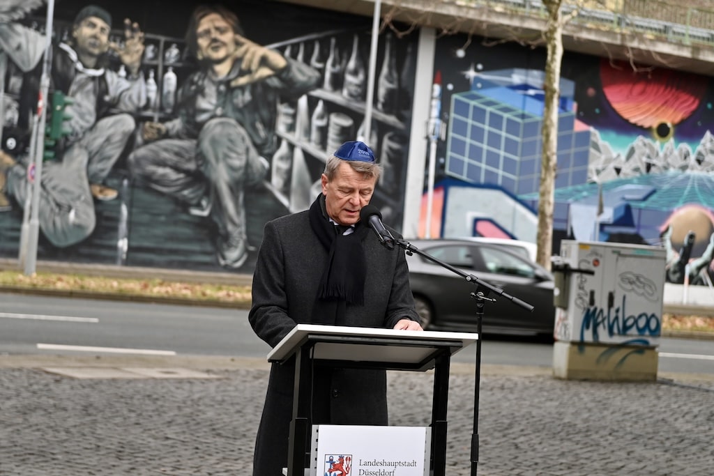 An der Gedenk­ver­an­stal­tung nah­men unter ande­rem Dr. Ste­phan Kel­ler, Ober­bür­ger­meis­ter der Lan­des­haupt­stadt, Chris­tof Rasche, Vize­prä­si­dent des nord­rhein-west­fä­li­schen Land­tags, Daniela Les­meis­ter, Staats­se­kre­tä­rin im Minis­te­rium des Innern des Lan­des Nord­rhein-West­fa­len, sowie Dr. Oded Horo­witz, Vor­stands­vor­sit­zen­der der Jüdi­schen Gemeinde Düs­sel­dorf, teil.