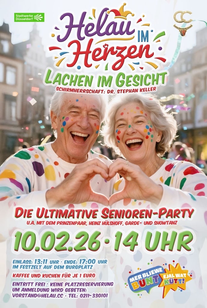 Düsseldorf. Das Comitee Düsseldorfer Carneval e.V. (CC) veranstaltet am Dienstag, 10. Februar, eine Karnevalsparty für ältere Jecken. Beginn ist um 13.11 Uhr im Festzelt auf dem Burgplatz. Unterstützt wird die Veranstaltung von den Stadtwerke AG.