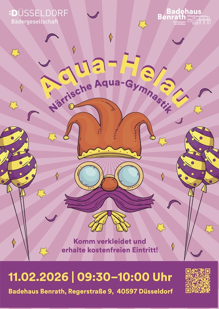 Los geht es am Diens­tag, 11. Februar, im Bade­haus Ben­rath. Von 9.30 bis 10 Uhr heißt es dort nicht „Sit­zung eröff­nen“, son­dern „ab ins Was­ser“. Beim bun­ten Kar­ne­vals­trai­ning ste­hen Bewe­gung, Musik und gute Laune im Vor­der­grund. Im Anschluss kön­nen sich die Teil­neh­men­den bei Kaf­fee und Ber­li­nern stär­ken – ganz karnevalstypisch.