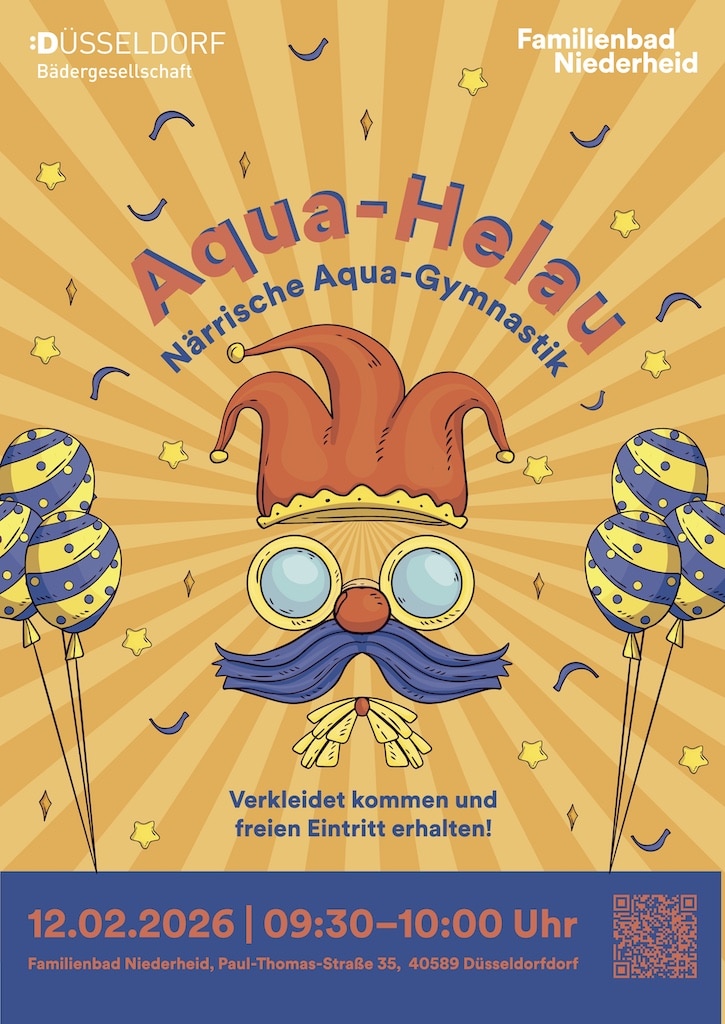 Einen Tag spä­ter, am Mitt­woch, 12. Februar, zieht das Fami­li­en­bad Nie­der­heid nach. Eben­falls von 9.30 bis 10 Uhr wird dort zur när­ri­schen Aqua-Gym­nas­tik ein­ge­la­den. Auch hier gilt: Mit­ma­chen ist aus­drück­lich erwünscht, Ver­klei­dung inklusive.