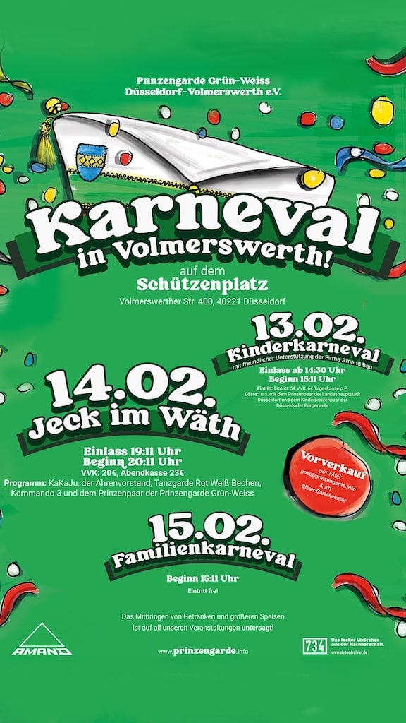 Wenn im klei­nen links­rhei­ni­schen Stadt­teil die Fah­nen in Grün und Weiß wehen, dann weiß man: In Vol­mers­werth ist wie­der Aus­nah­me­zu­stand – im bes­ten Sinne. Die Prin­zen­garde Grün-Weiss Düs­sel­dorf-Vol­mers­werth e.V. von 1948 star­tet mit 35 akti­ven Mit­glie­dern ins Kar­ne­vals­wo­chen­ende – und hat ihr neues Prin­zen­paar bereits gekürt.