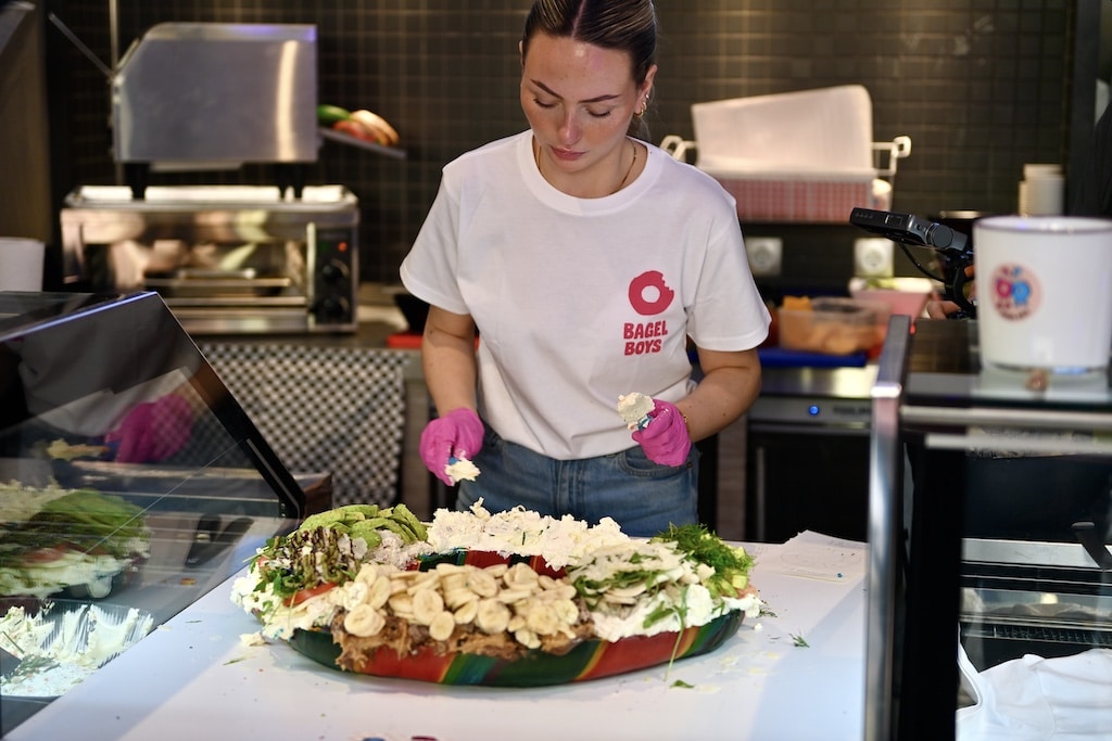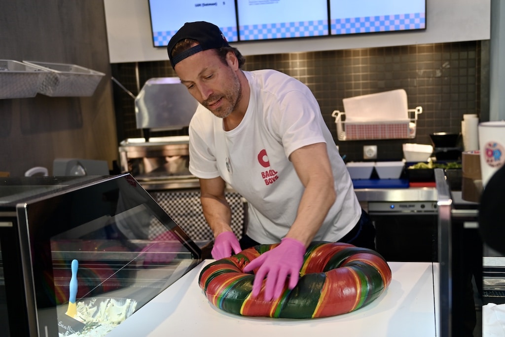 Während drinnen Bissen für Bissen verzehrt wurde, herrschte draußen beinahe Volksfeststimmung. Immer wieder brandete Applaus auf, wenn ein weiteres Stück geschafft war. Mitarbeitende der „Bagel Boys“ verteilten Kostproben an Wartende – von herzhaften Varianten wie „Italian Boy“ bis zur süßen Version „Birthday Boy“ mit bunten Streuseln. Niemand sollte hungrig bleiben, auch wenn der Hauptakteur sichtbar mit jedem weiteren Segment zu kämpfen hatte.