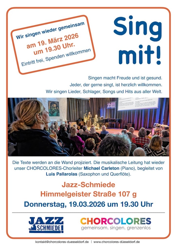 Die musikalische Leitung liegt in bewährten Händen: Chorleiter Michael Carleton begleitet die Teilnehmenden am Piano, während Luis Pallarolas an Saxophon und Querflöte für die musikalische Vielfalt sorgt. Das Duo hat sich in den vergangenen Veranstaltungen einen guten Ruf in der Düsseldorfer Kulturszene erarbeitet.