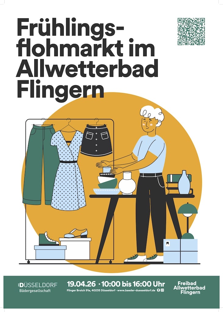 Mit stei­gen­den Tem­pe­ra­tu­ren und den ers­ten son­ni­gen Tagen kehrt auch eine beliebte Ver­an­stal­tung zurück: Die Bäder­ge­sell­schaft Düs­sel­dorf lädt am Sonn­tag, 19. April, erneut zum Früh­lings­floh­markt ins All­wet­ter­bad Flin­gern ein. Zwi­schen 10 und 16 Uhr ver­wan­delt sich das Gelände des Frei­bads in einen leben­di­gen Treff­punkt für Schnäpp­chen­jä­ger und Familien.
