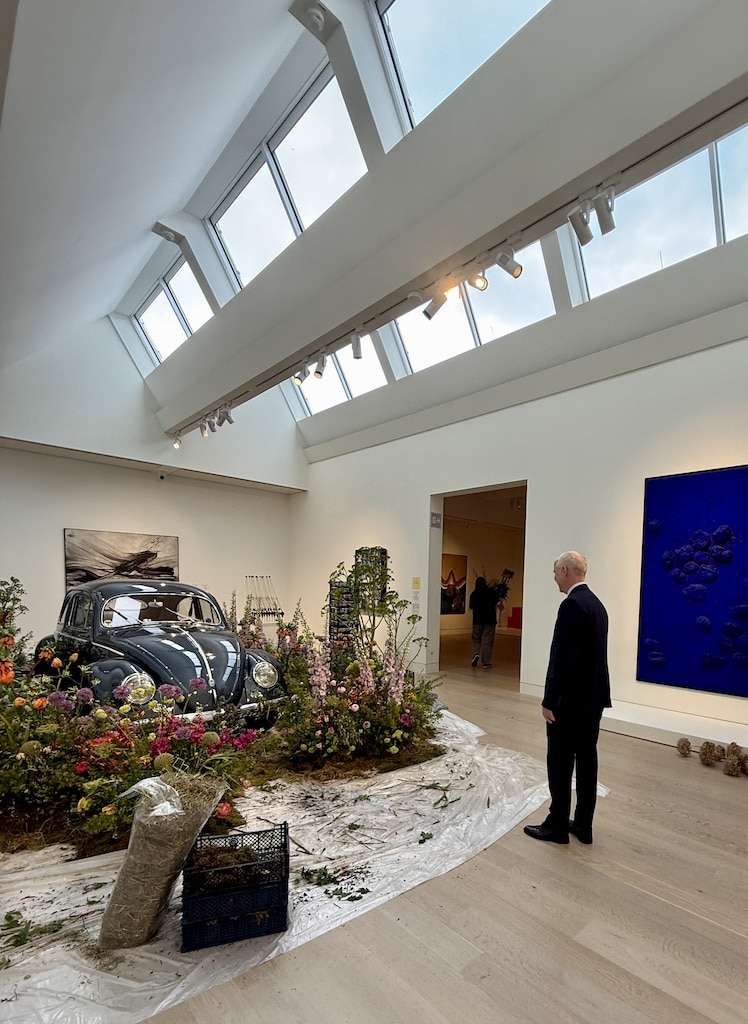 Das Zusammenspiel von Raum, Kunstobjekt und Blüteninstallation verändert die Räume – und vor allen Dingen die Wahrnehmung des Betrachters. Wie eben der bereits erwähnte blaue VW-Käfer: Ganz nüchtern auf seinem angestammten Platz in der Mitte eines hellen Raumes ist er ein Symbol für eine vergangene Epoche. Auf Hochglanz poliert und mit zwei Rosen in dem obligatorischen Blumenväschen am Armaturenbrett ist er natürlich eine Stilikone.