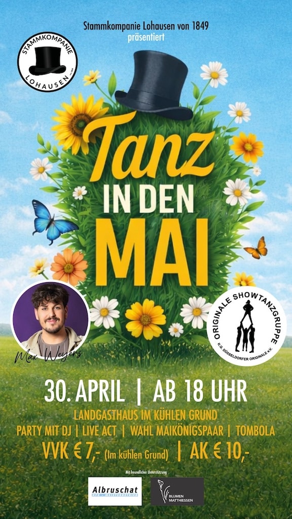 Im „Küh­len Grund“ wird am 30. April ab 18 Uhr in den Mai getanzt. Die Stamm­kom­pa­nie Lohau­sen, unter der Feder­füh­rung von Horst Forst­bach, hat ein schwung­vol­les Pro­gramm erstellt, das Lust aufs Mit­tan­zen macht.