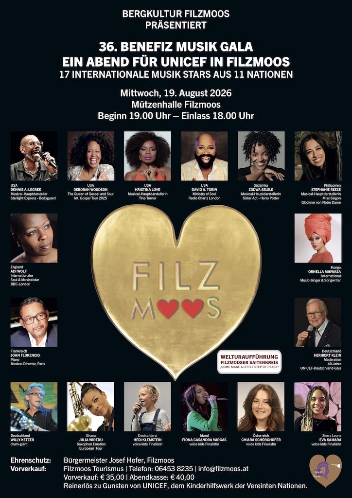 Wenn sich am 19. August die Türen der Müt­zen­halle öff­nen, wird das Berg­dorf Filz­moos im Salz­bur­ger Land ein­mal mehr zur inter­na­tio­na­len Bühne: Zum 36. „Abend für UNICEF“ rei­sen 17 Musik­stars aus elf Natio­nen nach Filz­moos. Ver­an­stal­ter und Tou­ris­mus­di­rek­tor Peter Dona­bauer spricht von einem „ein­ma­li­gen musi­ka­li­schen Ereig­nis“ – und meint damit nicht nur die Viel­zahl an hoch­ka­rä­ti­gen Künst­lern, son­dern auch die Strahl­kraft des Bene­fiz­ge­dan­kens zuguns­ten von UNICEF.