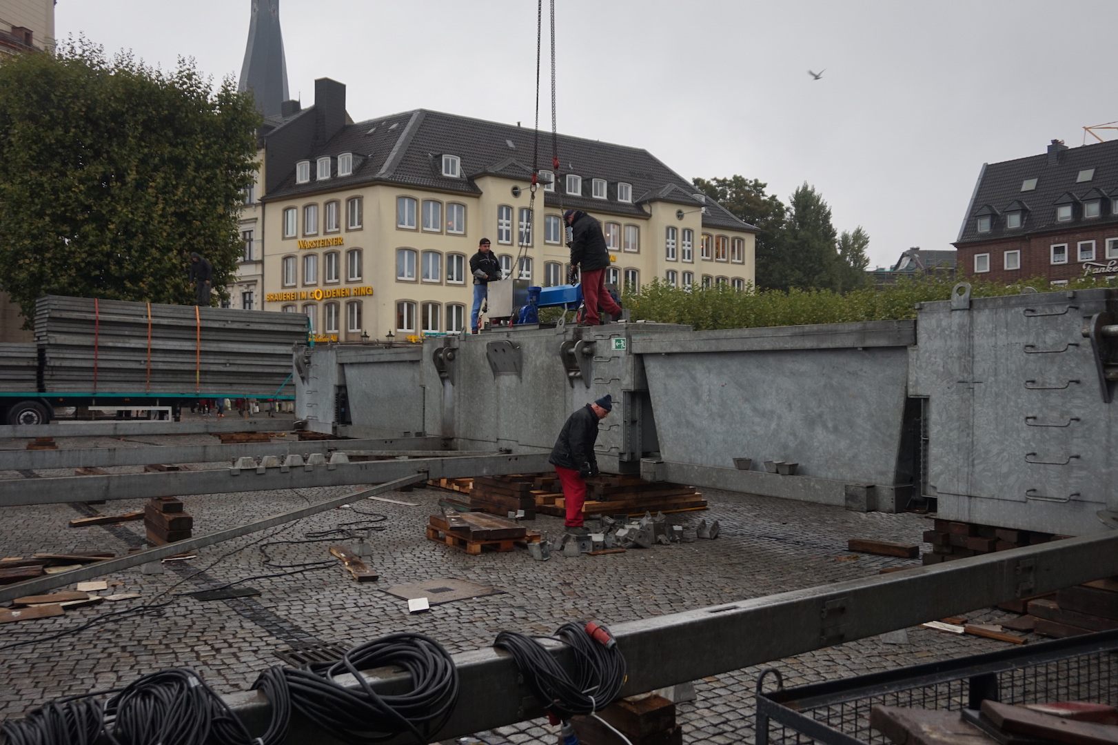 Auf dem Burgplatz haben die Arbeiten zum Aufbau des Riesenrades begonnen. Heute wurde mit dem Unterboden und den Halterungen angefangen. Danach kommt das Gerippe für das Rad, ab Dienstag sollen die Gondeln kommen.