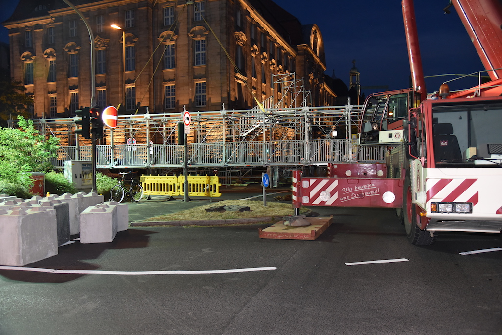 In der Nacht von Montag auf Dienstag wurde die erste von elf temporären Fußgängerbrücken an der Cecilienallee/Klever Straße installiert.