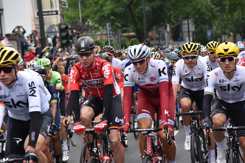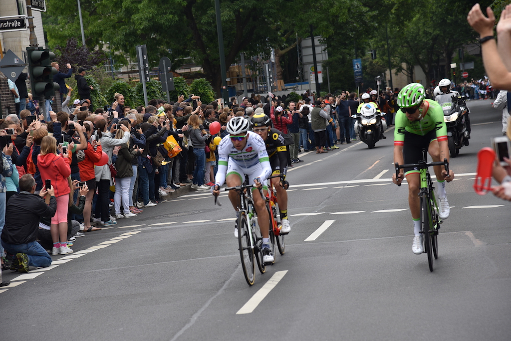 Um 12:30 Uhr war der offizielle Start an der Fischerstraße, nachdem die Radprofis um 12 Uhr vom Burgplatz abgefahren sind. Bis zum offiziellen Start fuhren die Profis durch die Altstadt Richtung Medienhafen und dann zur Fischerstraße. Diese 8 km lange Neutralisation gilt als Einrollphase bis zum Start. Direkt nach dem Start hat eine Vierergruppe bereits den ersten “Ausreißversuch” unternommen und waren ca 30 Sekunden vor dem Feld.