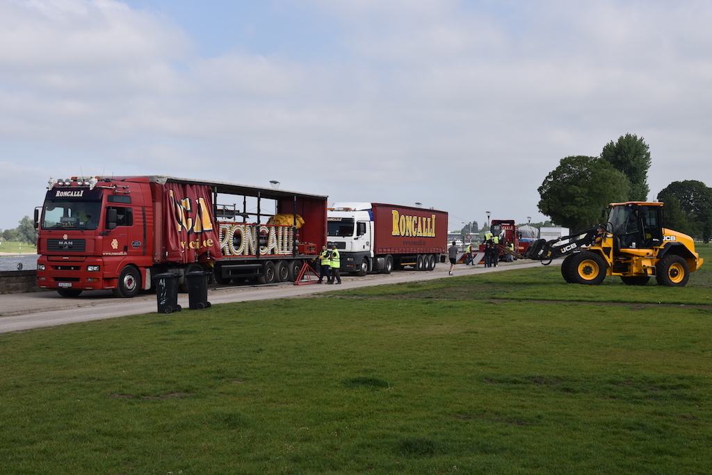 Heute in den frühen Morgenstunden starteten die starken Kollegen um Betriebsleiter Patrick Philadelphia und Zeltmeister Michele Rossi dort mit dem Aufbau der nostalgischen Roncalli-Welt. Insgesamt sind es 25 Mann die den Zeltaufbau in zwei Tagen erledigen. Der Circus Roncalli hat insgesamt sechs vollständige Zirkuszelte, vier davon sind zurzeit aufgebaut. Während des Aufbaues in Düsseldorf laufen die Vorstellung in Köln noch bis einschließlich Montag, den 21. Mai. 2018