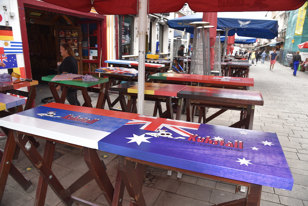 Wie überall in der Stadt bereitet man sich auch in der Altstadt auf die WM vor. Wie hier im Kuhstall oder auch im Engel und Schweinske will man den Gästen WM Fehling bieten. So wurden hier die Tische heute mit den Flaggen der teilnehmenden Länder beklebt. Im Engel allerdings nur in schwarz/weiß.