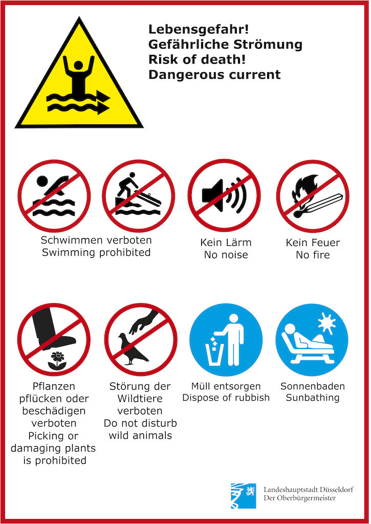 Darüber hinaus ist an den beiden städtischen Zugängen — Zur Lindung und an der Holzbrücke An der Anger — jeweils ein Hinweisschild aufgestellt worden. Damit soll auf die Verhaltensregeln am Angermunder Baggersee aufmerksam gemacht werden. Dieses Hinweisschild trägt auch ein Zusatzschild Lotsenstelle, um den Standort im Bedarfsfall an die Rettungskräfte zu übermitteln.