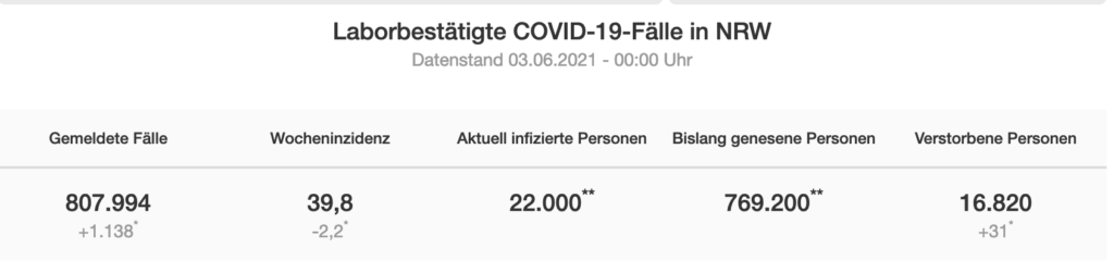 Mit aktuellem Stand wurde — seit dem 03.03.2020 — bei insgesamt 24.909 (+24) Düsseldorferinnen und Düsseldorfern eine Infektion mit dem Coronavirus diagnostiziert. Laut der Information des Landeszentrums Gesundheit NRW (LZG) sind aktuell rund 440* Personen in Düsseldorf infiziert.