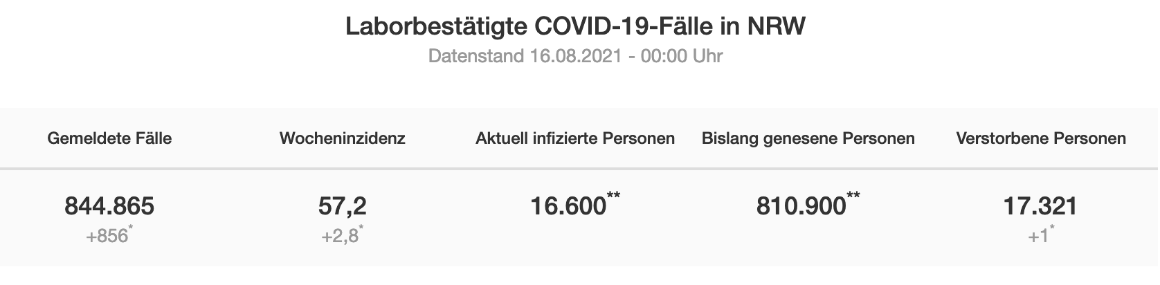 Mit aktuellem Stand wurde — seit dem 03.03.2020 — bei insgesamt 26.903 (+63) Düsseldorferinnen und Düsseldorfern eine Infektion mit dem Coronavirus diagnostiziert. Laut der Information des Landeszentrums Gesundheit NRW (LZG) sind aktuell rund 660* Personen in Düsseldorf infiziert.