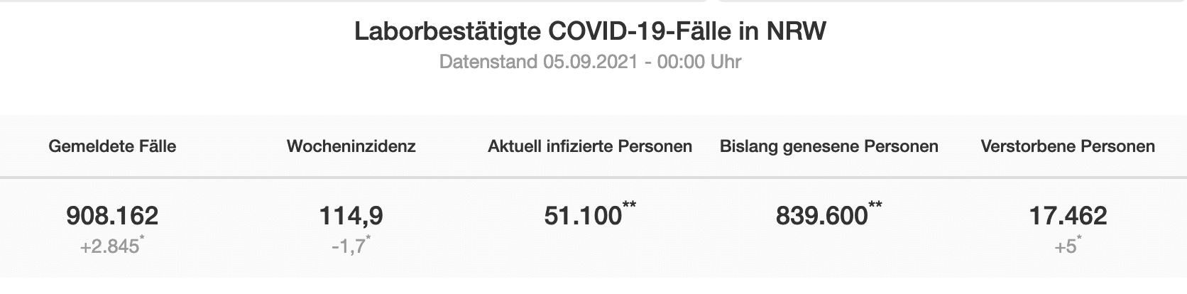 Von den Infizierten werden 74 in Krankenhäusern behandelt, davon 18 auf Intensivstationen. 27.500* Düsseldorferinnen und Düsseldorfer sind inzwischen genesen. 452 (+/- 0) Menschen, die mit dem Coronavirus infiziert waren, sind bisher in Düsseldorf gestorben. Die sogenannte 7‑Tages-Inzidenz liegt nach den vorliegenden Zahlen derzeit in Düsseldorf bei 157,3 (Vortag: 148,4) — dieser Wert gibt die Zahl der bekannt gewordenen Infektionen in den letzten 7 Tagen pro 100.000 Einwohner
