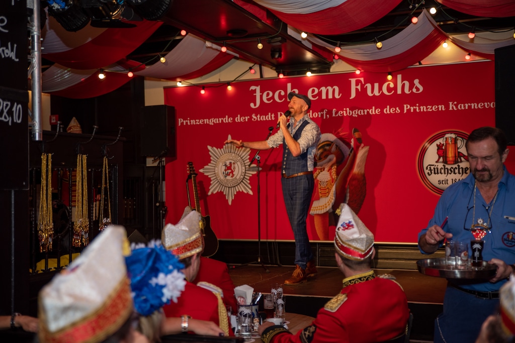 Martin Schopps kommt nach einer kurzen Begrüßung von Dirk Kemmer, Präsident und Vorsitzender des Vereins, als Eisbrecher auf die Bühne. Gekonnt holt der Künstler nach wenigen Sätzen das Publikum auf seine Seite. Themen aus dem Leben eines Lehrers zeigen Geschichten, die man sich nur schwer ausdenken kann. Und irgendwo scheint es so, als würde jeder im Raum das ein oder andere wiedererkennen. Als zweiter Wortbeitrag kommt gegen Mittag „Oli der Köbes“ auf die Bühne. Auch er ist nicht das erste Mal im Fuchs. Und was kann es Passenderes geben als ein Köbes im Brauhaus. Wortgewand und schlagfertig sind seine Sprüche. Und die Interaktion mit dem Publikum auf höchstem Niveau.