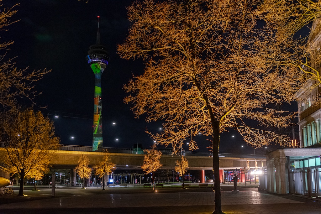 Noch bis zum 26. März wird der Rheinturm in Düsseldorf täglich ab 19 Uhr in eine Illumination gehüllt.
