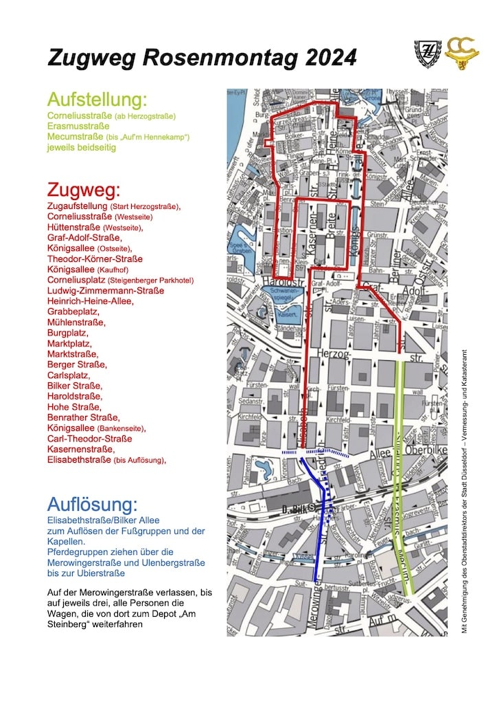 Der Höhepunkt des Karnevals, der Rosenmontagszug, verspricht auch in diesem Jahr ein Spektakel zu werden. Mit einem Start um 12:24 Uhr an der Ecke Corneliusstraße/Herzogstraße und einer Fernsehübertragung ab 13:30 Uhr am Rathaus, werden rund 11.285 Teilnehmer erwartet, darunter 123 Wagen, 131 Zugfahrzeuge, 109 Fußgruppen, 18 Reitpferde und 22 Musikapellen plus 5 Musikwagen. Die TV-Übertragungen erfolgen in der ARD auf ONE und im ERSTEN sowie im WDR.