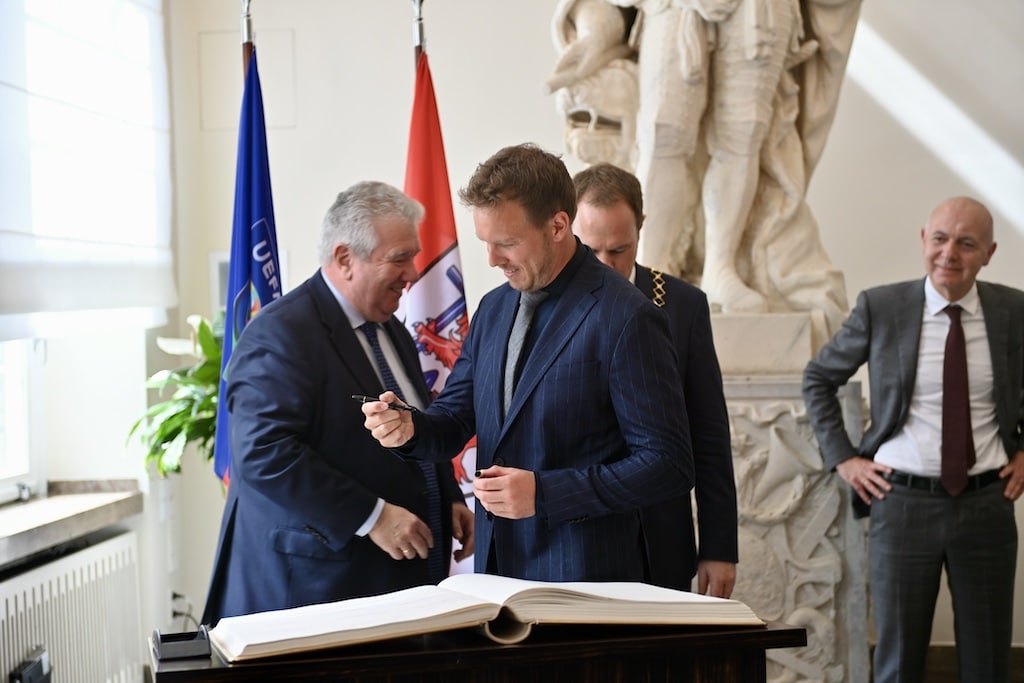 Allen voran DFB-Päsident Bernd Neuendorf , der natürlich die nordrheinwestfälische Landeshauptstadt lobte. „Die Begeisterung für den Sport, dafür steht Düsseldorf insbesonders“, sagte der Fußball-Cheffunktionär. In der Vorbereitung zur EM 2024 sei die Stadt „ganz hervorragend unterwegs.“ Nachdem OB Stephan Keller seine Vorfreude und die der Stadt ausdrückte, trug sich die Delegation mit Bundestrainer Julian Nagelsmann und Rudi „Tante Käthe“ Völler (als Sportdirektor verlängert), Turnierdirektor Philipp Lahm und UEFA-Botschafterin Célia Šašić ins Goldene Buch der Stadt ein.