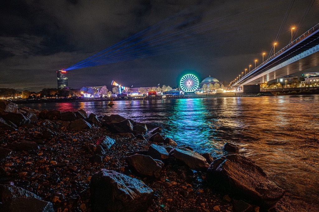 Sobald die Dun­kel­heit her­ein­bricht, ver­wan­delt sich der Turm in eine leuch­tende Bühne. Bis kurz nach Mit­ter­nacht tan­zen far­bige Laser­strah­len über den Rhein und zeich­nen ein fas­zi­nie­ren­des Pan­orama über die Stadt. Das Ganze wird von einer eigens kom­po­nier­ten Musik beglei­tet, die direkt vom Dach des ERGO-Towers erklingt.
